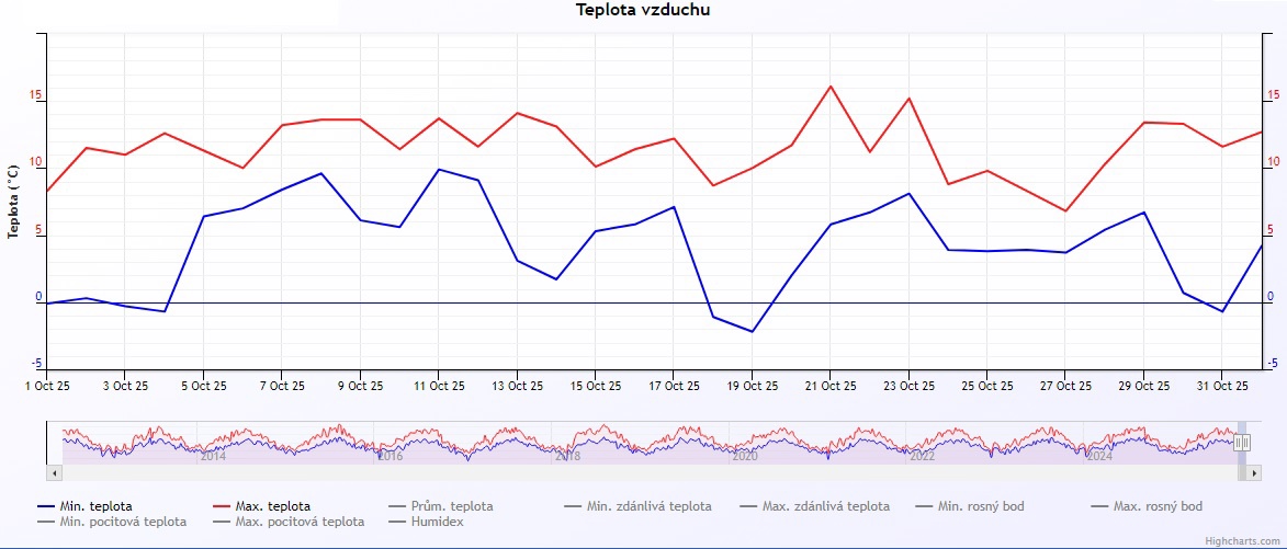 Nejvyšší teplota 16,1 °C dne 21. října 2025